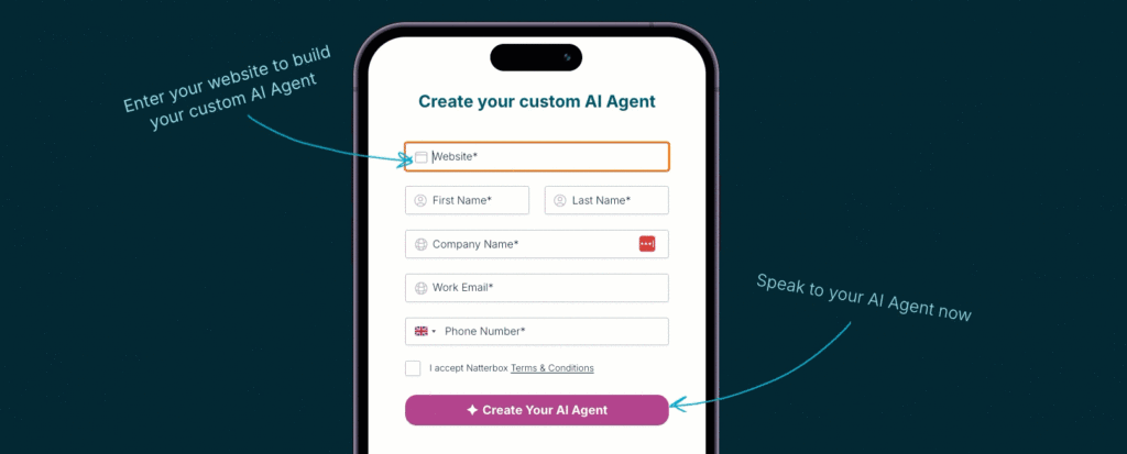 Enter your business website to activate your custom AI Agent. Within 60 seconds, you’ll be able to phone in and have a real conversation.